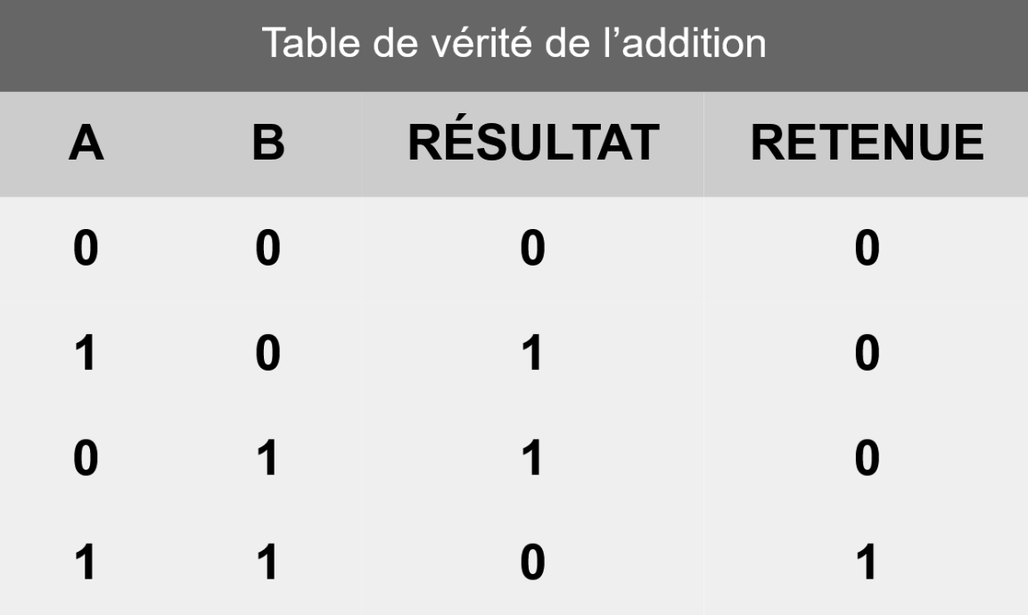 Ce dernier cas est crucial car 1 + 1 en entré ne donne pas « 1 » en sortie mais « 0 » ainsi qu’une retenue de 1 (tout comme 5 + 5 en décimal donne 0 et une retenue de 1). Pour additionner deux chiffres binaires (A et B), nous avons donc besoin de deux sorties à notre circuit : une pour le Résultat (la somme) et une pour la Retenue (le report). Écrivons maintenant la table de vérité de ce circuit que nous allons réaliser :